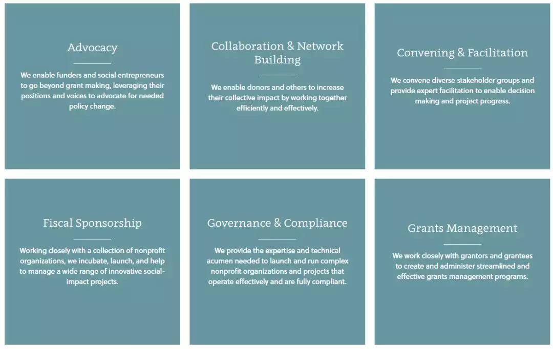 我们还有一个影响力投资部门,我们正在寻找符合客户公益利益的营利性投资。如果客户关心教育改革问题,那么我们会去寻找教育科技公司的投资机会。另外,我们管理着捐赠人之间的合作,比如5个捐赠人想要联合起来,共同解决美国的可持续能源问题以及影响其的政策问题,我们将管理联合捐赠项目,通过共同努力来促进他们的工作。