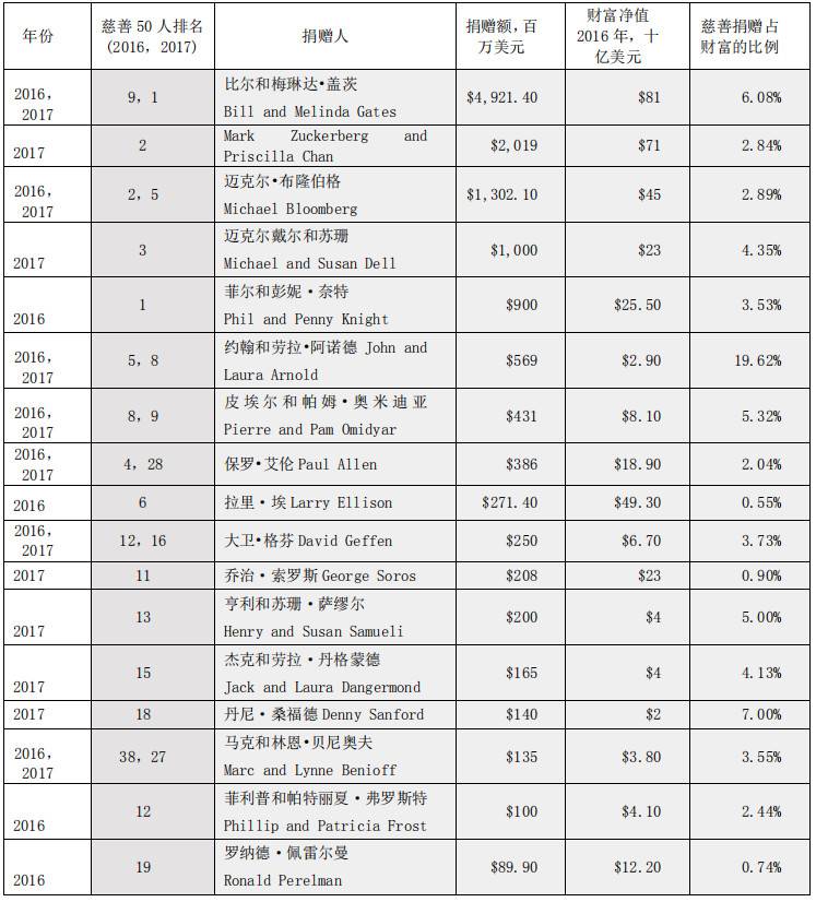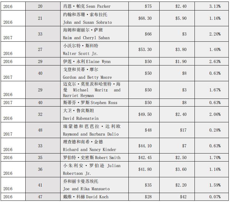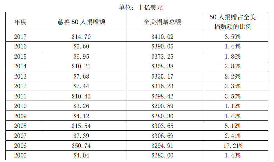 根据笔者对美国历年捐赠数据的整理分析,发现最慷概的 50 个慈善家从 2005-2017年共捐赠了 1481 亿美元,这个数字超过同期全美捐款的 3%(表 1)。