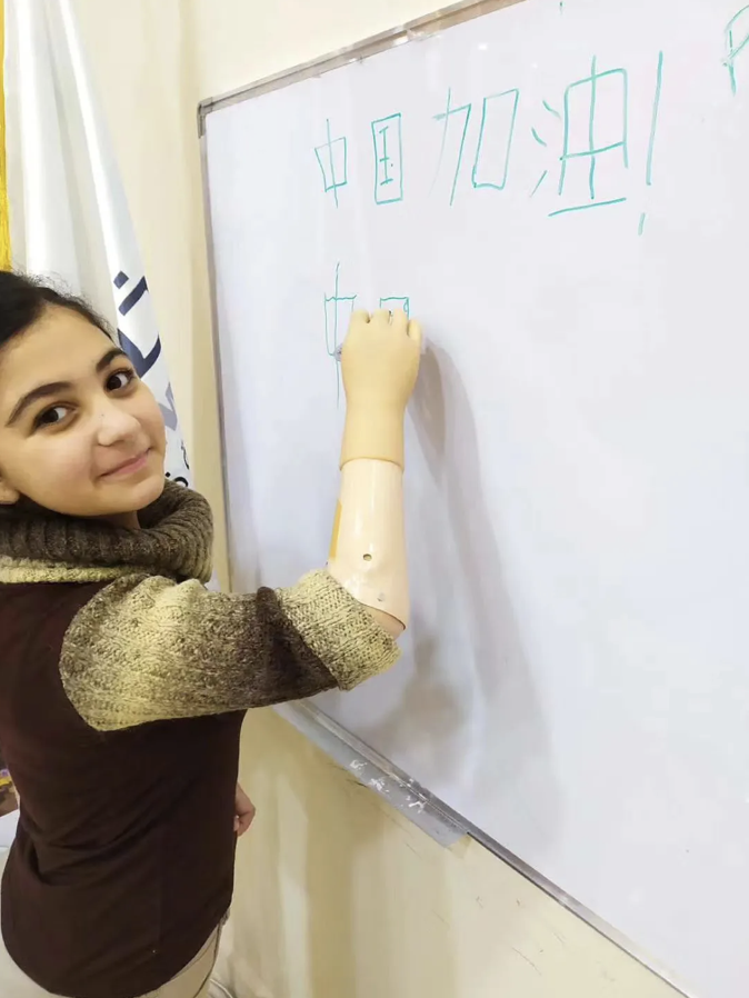 有一个安装义肢的小朋友写了一个我的搭档的名字“明明”,他是13岁的瓦尔德,通过项目安装了双手,现在他可以自己写字了,大大的提升了生活的自主能力。在此之前他等待了四年之久,现在他终于拥有了双手,可以写字给他的妈妈,也可以去上学了。